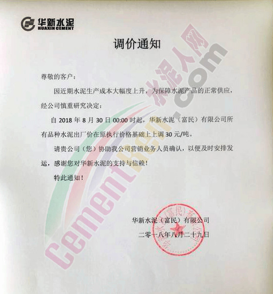 昨日(29日),闻喜冀东也发布了调价通知。调价通知称,由于近期环保限产,市场发生巨大变化,原材料价格猛涨,导致公司运营成本不断上升,定于8月29日中午12点起针对水泥所有品种上调30元/吨。
