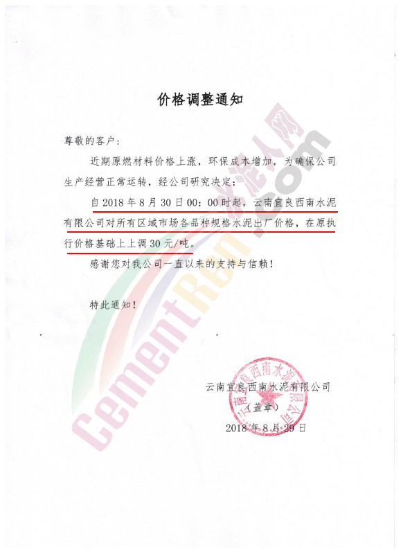 区域龙头企业云南宜良西南水泥有限公司价格调整通知称,因近期原燃材料价格上涨,环保成本增加,为确保公司生产经营正常运转,经公司研究决定,自今日(8月30日)零点起,云南宜良西南水泥有限公司对所有区域市场各品种规格水泥出厂价格,在原执行价格基础上上调30元/吨。