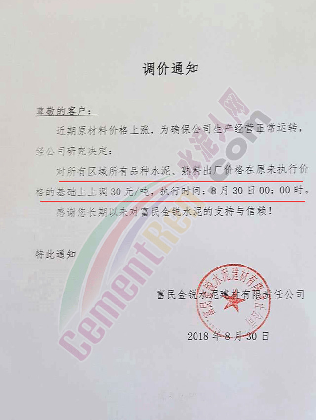 富民金锐水泥建材有限责任公司调价通知称:由于近期原材料价格上涨,为确保公司生产经营正常运转,经公司研究决定 ,自今日(8月30日)零时起对所有区域品种水泥、熟料出厂价格在原执行价格基础上上调30元/吨。