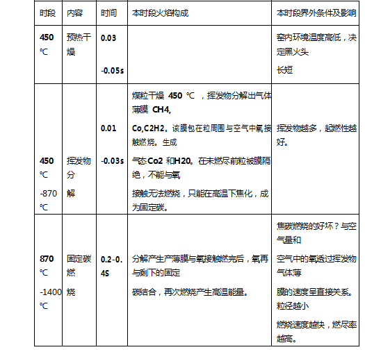 煤粒径越小,燃烧速度越快,燃尽率越高。粒径 100 微米 1.5S 燃尽,88 微米 1.3S 燃尽。