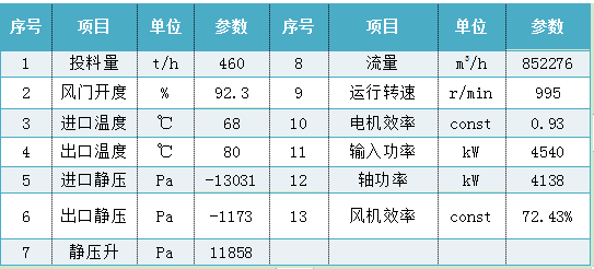 2017年,江苏HL水泥为解决风机运行工况不在最佳效率范围的问题,邀请了上海瑞晨进行现场标定,二线所用原料磨循环风机经现场检测,运行效率72.43%,能耗较高;主要运行参数为: