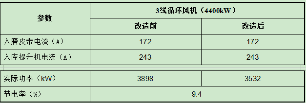 上海瑞晨高效风机技术得到业主领导认可,因而其3线循环风机也已经交由瑞晨进行技术改造。同工况对比下,小时节电量达到366kW,节能效果显著,设备运行稳定。