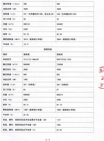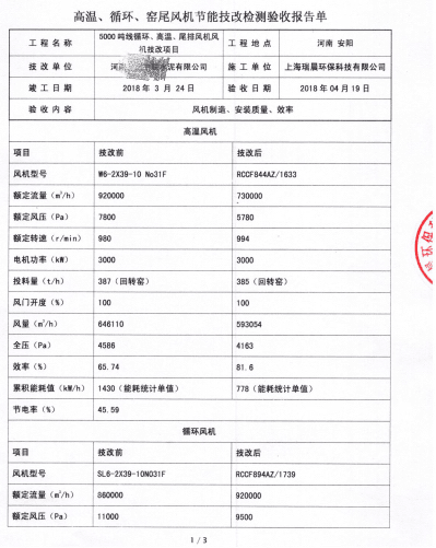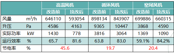 安阳ZL公司拥有一条5000t/d新型干法水泥生产线,年产熟料180万吨,水泥260万吨。瑞晨针对高温、循环、尾排风机进行节能改造,原风机运行效率分别为65.7%、63.8%、59.1%,改造后,风机运行效率分别达到了81.6%、83.0%、84.2%,同等工况下,高温、循环、尾排风机小时节电量达到1683kW(远远超过约定值1157kW)。