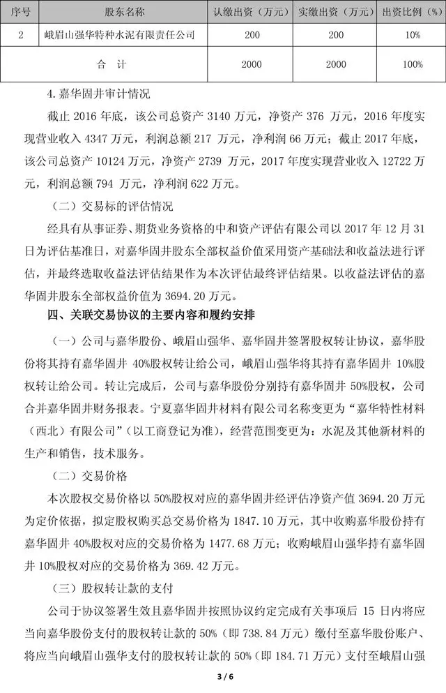 转让完成后,公司与嘉华股份分别持有嘉华固井50%股权,公司合并嘉华固井财务报表。本次收购将拓展新的销售渠道,提升公司特种水泥市场竞争能力。公告原文如下: