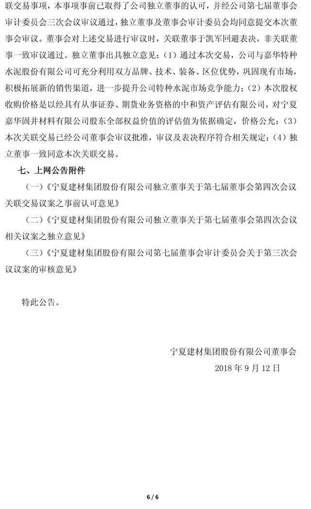 宁夏建材公告,公司以现金1477.68万元收购嘉华特种水泥股份有限公司持有宁夏嘉华固井材料有限公司40%的股权、以现金369.42万元收购峨眉山强华特种水泥有限责任公司持有的嘉华固井10%的股权。
