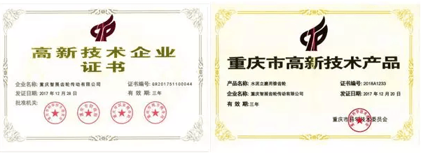 5、公司研制生产的“ 高精度大型螺旋锥齿轮和锥齿轮轴” 通过了重庆市高新技术产品认定,并荣获“ 国家高新技术企业” 证书。