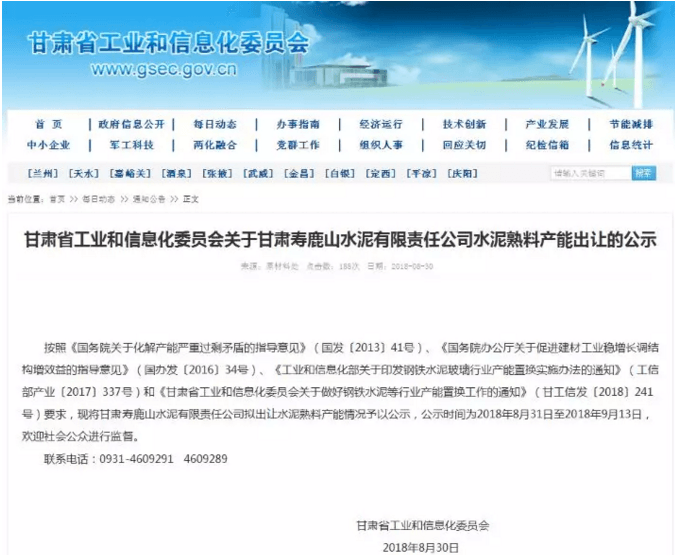 据水泥人网了解甘肃省工业和信息化委员会曾在8月30日发布《关于甘肃寿鹿山水泥有限责任公司水泥熟料产能出让的公示》,公示时间为公示时间为2018年8月31日至2018年9月13日。