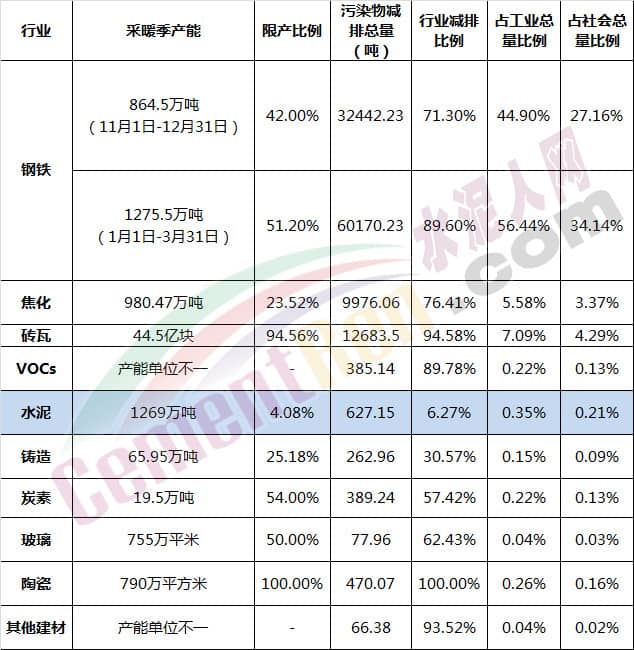 水泥行业(不含粉磨站)根据承担居民供暖、协同处置城市垃圾或危险废物及高速公路重点建设项目等保民生任务量核定最大允许生产负荷外,其余企业错峰期间全部停产,行业限产比例4.08%。
