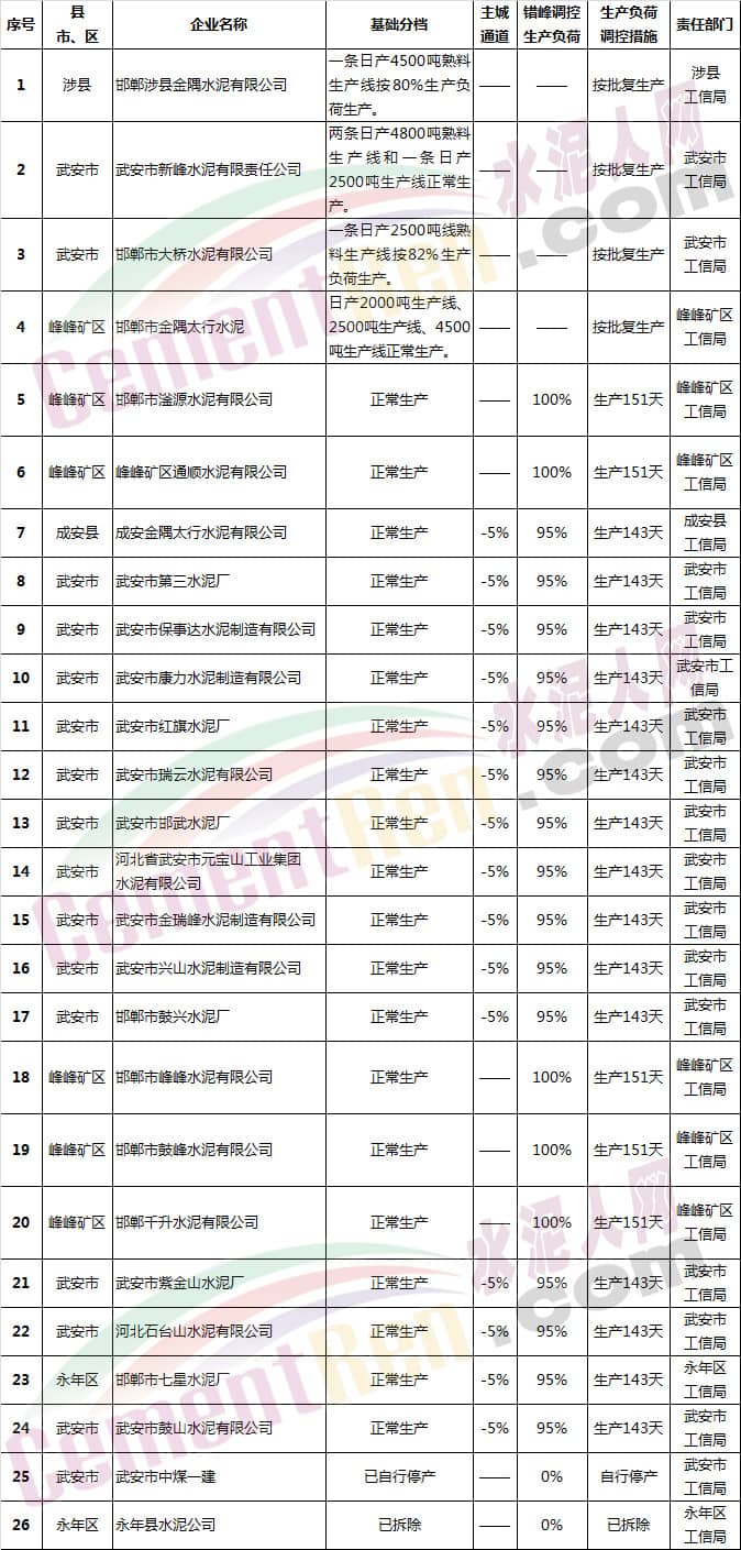 (一)水泥企业(不含粉磨站)除承担居民供暖、协同处置城市垃圾或危险废物及高速公路重点建设项目等保民生任务的,要根据承担任务量核定最大允许生产负荷外,其余企业错峰期间全部停产,在2018年9月底前报邯郸市人民政府备案。水泥粉磨站按通用指标进行绩效评价,最终确定企业采暖季错峰生产方案。9月底未按标准验收合格的企业停产。