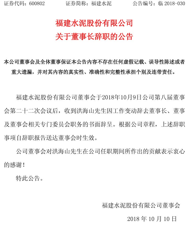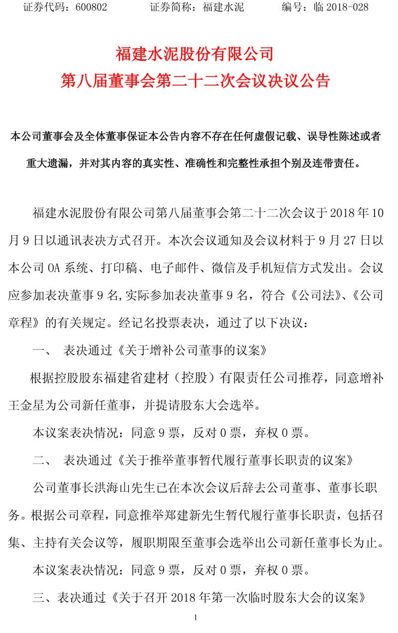同期,福建水泥股份有限公司第八届董事会第二十二次会议于2018年10月9日以通讯表决方式召开。经记名投票表决,通过了以下决议: