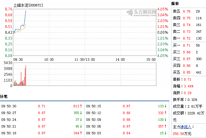 10月10日,上峰水泥盘中快速上涨,5分钟内涨幅超过2%,截至9点50分,报8.71元,成交2226.42万元,换手率0.32%。
