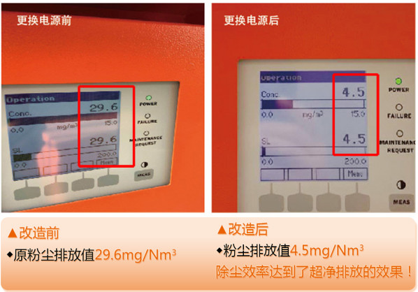 煤山南方水泥本次技改中,除尘器本体检修和改造,是利用停窑检修期间完成的。为验证智能变频脉冲电源的除尘效率,除尘电源是在生产期间进行不停窑更换的,更换前在线监测显示粉尘排放为29.6 mg/Nm3,更换完成后,监测仪显示粉尘排放很快降低至4.5 mg/Nm3左右,除尘效果显著且直观真实!