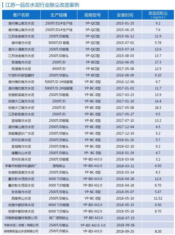 目前,该套电除尘超低排放改造技术和方案,已由江苏一品环保在90余条水泥生产线上应用和验证,均获得了非常显著的效果。实践证明,水泥行业原有的电除尘器,只要能确保除尘器本体各项工况完好,并对电场内部加以技术改造,配合生产工艺的严格把控,选择合适先进的除尘电源,使粉尘达到超低排放,完全可以实现!