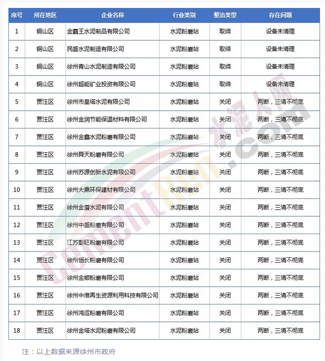 近日江苏省徐州市政府印发《徐州市2018-2019年秋冬季大气污染综合治理攻坚行动方案》。方案提出对保留和处于过渡期内已按要求完成整治并通过复产验收的水泥粉磨站,在黄色及以上重污染天气预警期间实施停产,徐州市共19家粉磨站企业列入管控名单。同期公布的徐州市“散乱污”企业集中整治专项行动现场核查问题清单显示,有18家粉磨站企业列入关闭、取缔名单。