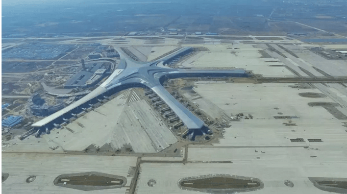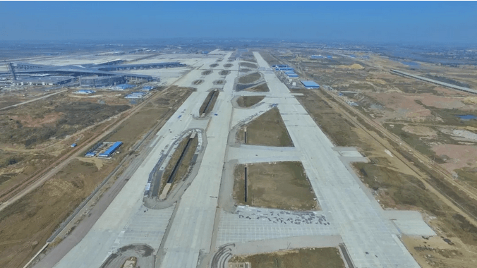 青岛新机场工程一期共建设两条独立运行的平行远距跑道,其中,东跑道长3600米、宽60米,飞行区等级为4F,可起降当前最大空客380、波音747机型;西跑道长3600米、宽45米,飞行区等级4E。跑道间距2184米,西跑道相对东跑道向南错开500米。