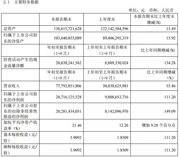 其中,第三季度,集团实现营业收入约320.50亿元,同比增长76.77%;归属于上市公司股东的净利润77.74亿元,同比增长151.43%;基本每股收益1.47元。