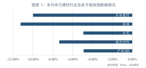 本月大盘持续表现不佳,沪深300指数下降4.90%,申万建材指数下降7.35%,其中水泥板块下降4.93%,水泥板块表现出较强韧性。
