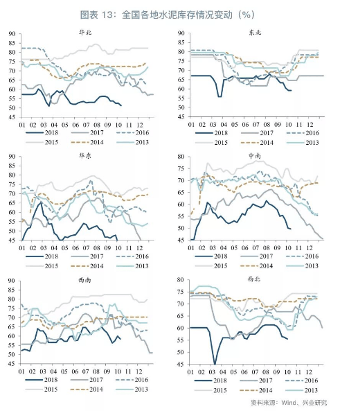水泥:兴业研究水泥景气度指标显示当前水泥仍处高景气度区间,本月水泥整体表现较好,量价齐升,但区域之间仍有所分化,华东和中南地区仍表现较好,西北和东北地区受需求端低迷拖累景气度难有起色。展望后市,本月固定资产投资有企稳迹象,但基建投资持续下滑,考虑政府在基建投资的发力,财政政策和货币政策持续宽松,预计基建投资复苏可期。而且从短期来看,10月下旬全国多数地区适宜开工,水泥库存处于历史低位,短期水泥高景气度仍然持续,但受环保高压有所放松影响,中期内承压。
