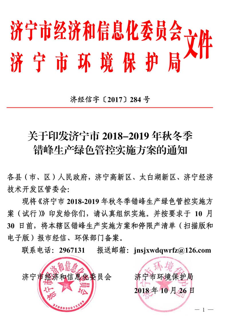 《济宁市2018-2019 年秋冬季错峰生产绿色管控实施方案(试行)》提出为贯彻落实《京津冀及周边地区2018-2019 年秋冬季大气污染综合治理攻坚行动方案》和省、市秋冬季大气污染防治方案,按照济宁市委、市政府要求,深入推进2018-2019 年采暖季工业企业错峰生产,持续改善区域空气质量,特制定本方案。