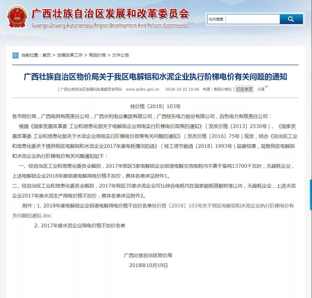 日前,广西壮族自治区物价局发布关于水泥企业执行阶梯电价有关问题的通知。通知称,根据《国家发展改革委 工业和信息化部关于电解铝企业用电实行阶梯电价政策的通知》(发改价格〔2013〕2530号)、《国家发展改革委 工业和信息化部关于水泥企业用电实行阶梯电价政策有关问题的通知》(发改价格〔2016〕75号)规定,结合《自治区工业和信息化委关于提供我区电解铝和水泥企业2017年度电耗情况的函》(桂工信节能函〔2018〕1993号)监察结果,就广西壮族自治区水泥企业执行阶梯电价有关问题做如下通知。 通知原文: 来源:广西壮族自治区发改委