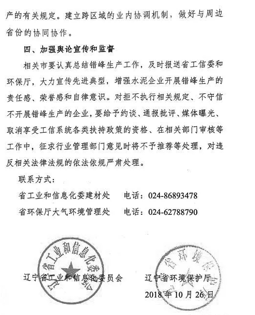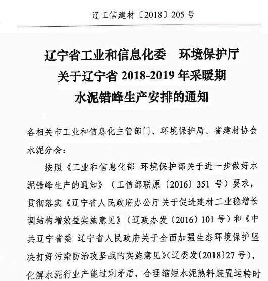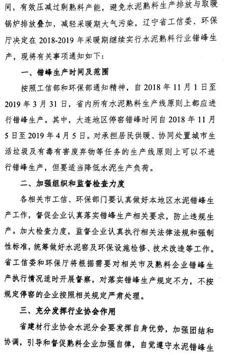 辽宁省工信委和辽宁环保厅下发了2018-2019年采暖期水泥错峰生产安排,通知要求,自2018年11月1日至2019年3月31日,省内水泥熟料生产原则上都进行错峰生产,大连地区时间为2018年11月5日至2019年4月5日,对承担居民供暖、协同处置城市生活垃圾及有毒有害废弃物任务的生产线可以不进行错峰,但要适当降低水泥生产负荷。