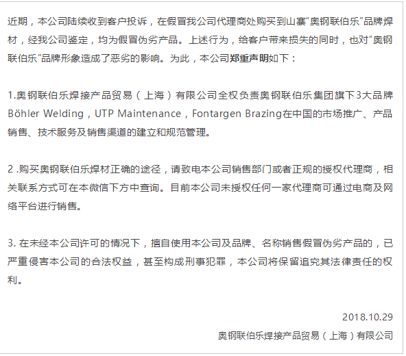 再次感谢用户朋友对奥钢联伯乐焊接长久以来的信任与支持,请通过正规途径购买奥钢联伯乐焊材!