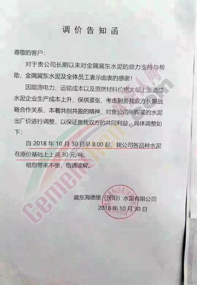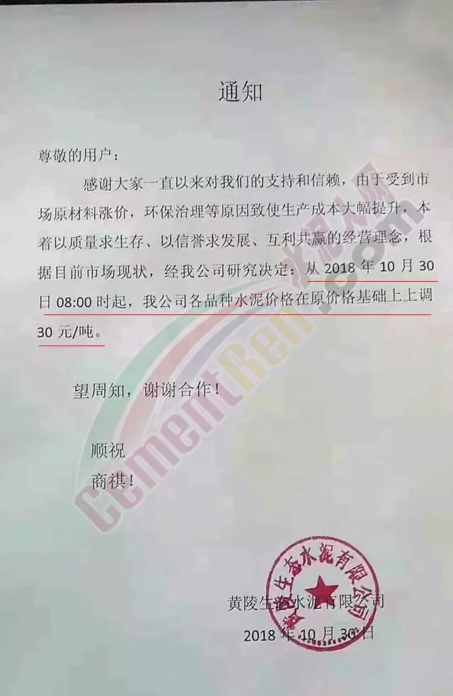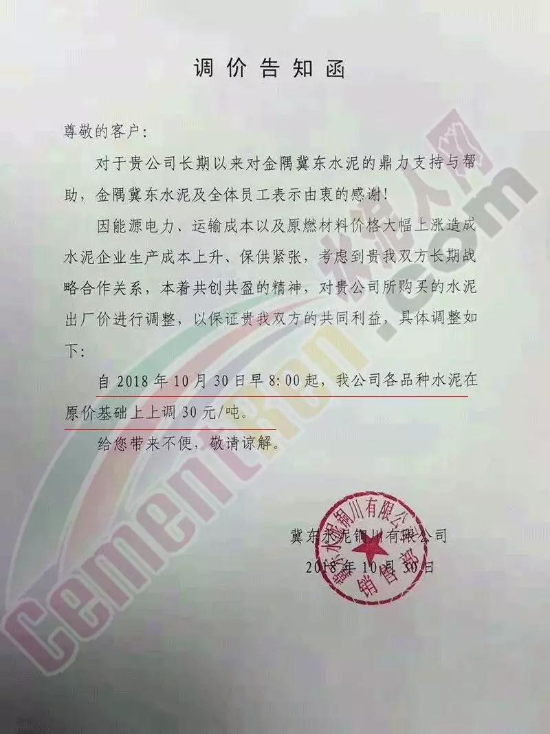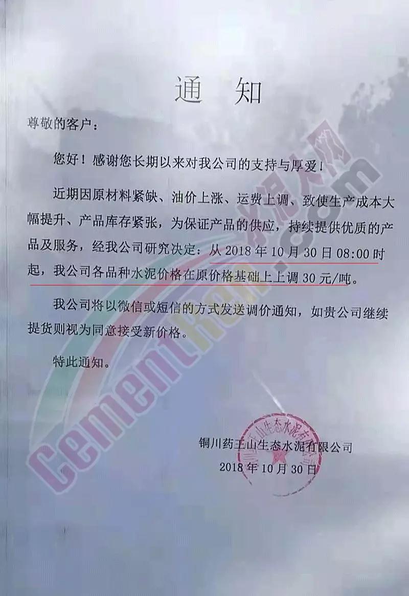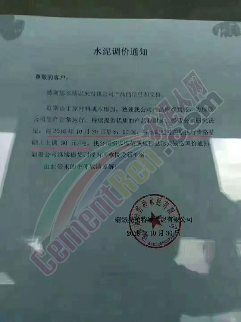 根据当前错峰生产、市场行情及原材料价格上涨情况,经公司研究决定,自2018年10月30日8时起,对PC32.5袋装及散装价格上调50元/吨。