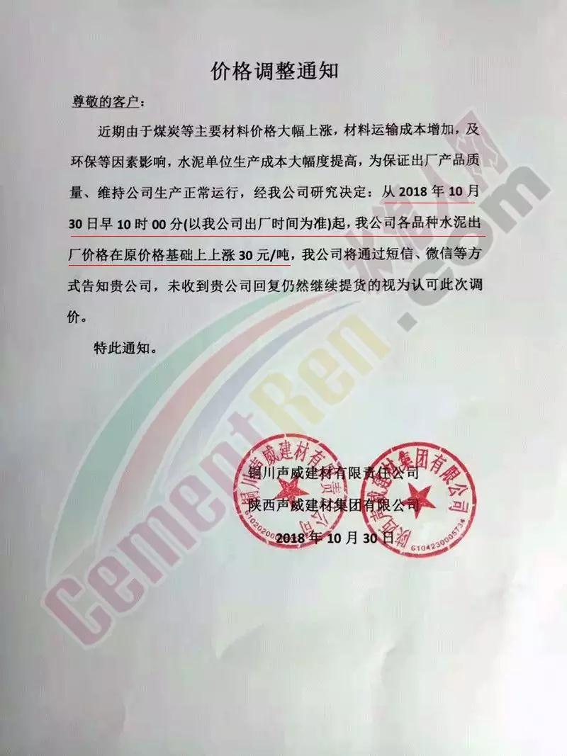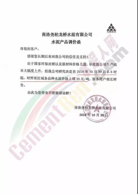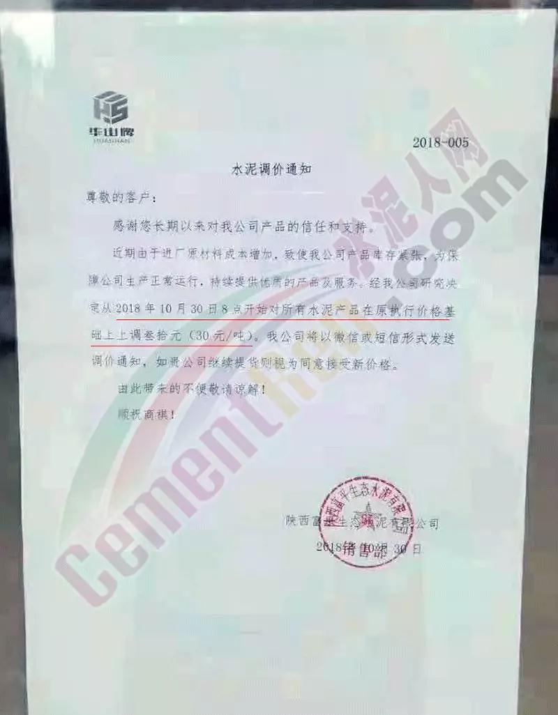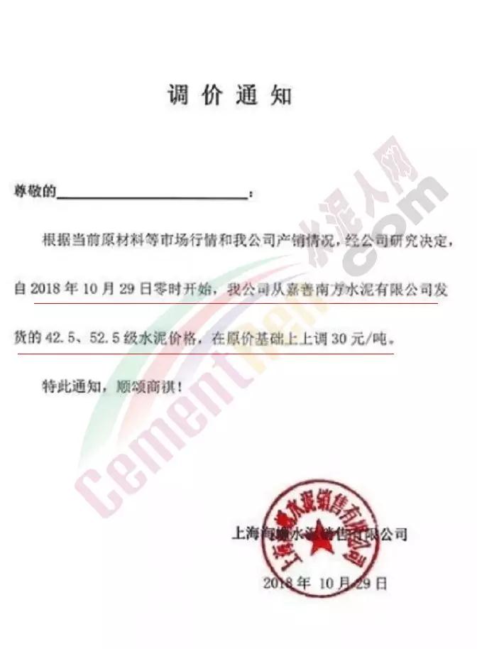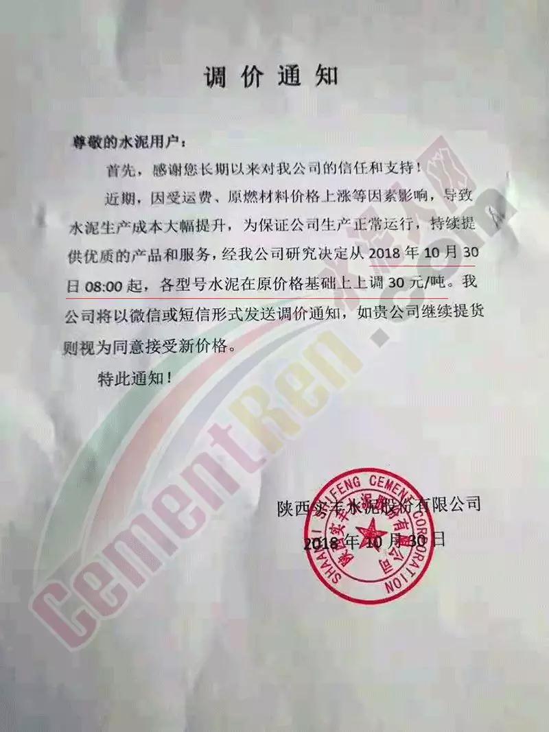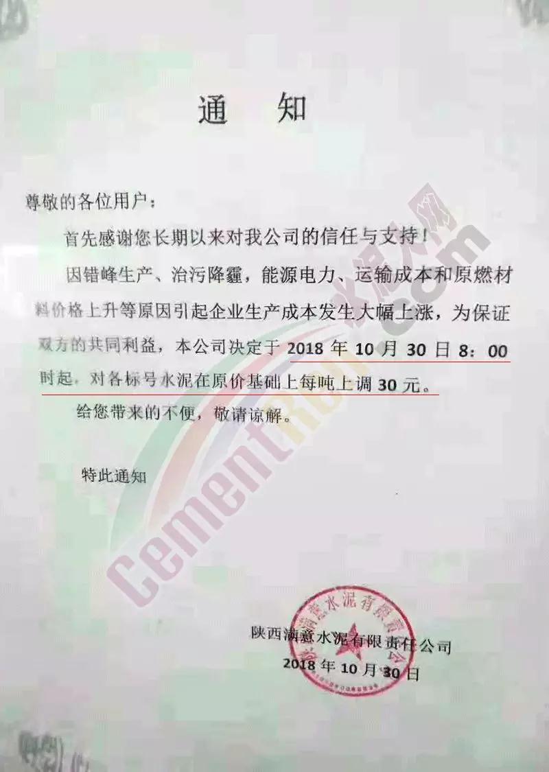 根据当前错峰生产、市场行情及原材料价格上涨情况,经公司研究决定,自2018年10月30日8时起,对PC32.5袋装及散装价格上调50元/吨。