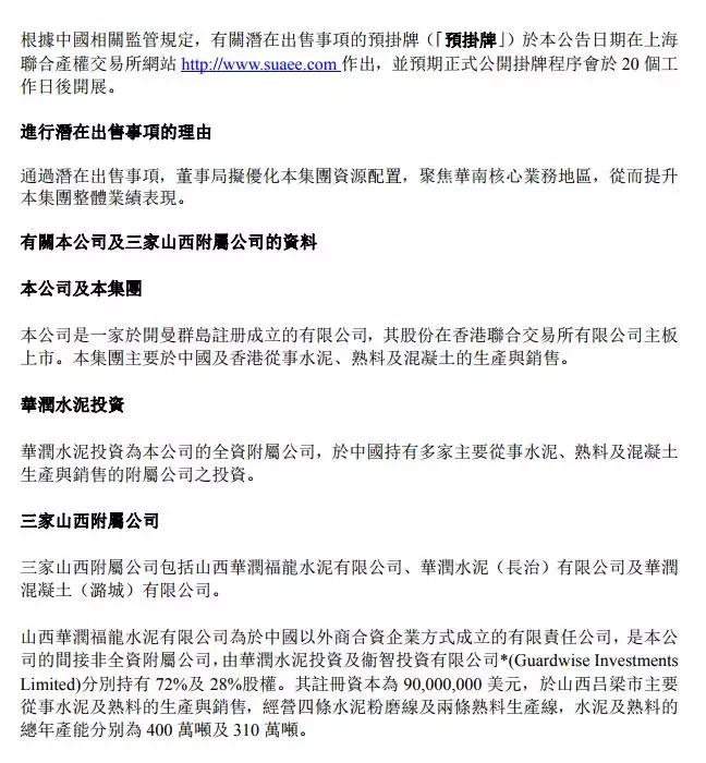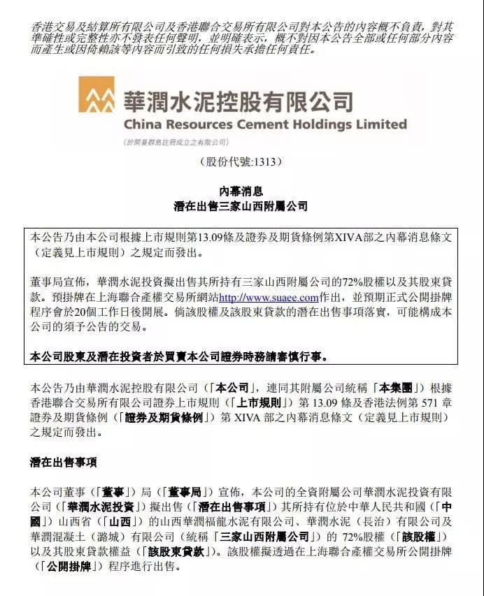 华润水泥控股(01313.HK)公告,公司的全资附属华润水泥投资拟出售其所持有位于山西省的山西华润福龙水泥有限公司、华润水泥(长治)有限公司及华润混凝土(潞城)有限公司(统称三家山西附属公司)的72%股权以及其股东贷款权益。该股权拟透过在上海联合产权交易所公开挂牌程序进行出售。
