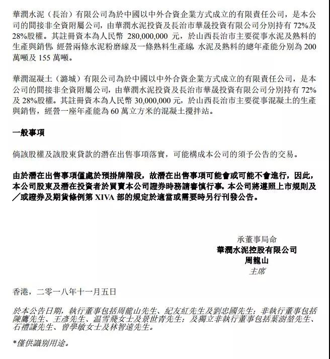 据悉,山西华润福龙水泥有限公司为于中国以外商合资企业方式成立的有限责任公司,是公司的间接非全资附属公司,由华润水泥投资及衞智投资有限公司*(Guardwise Investments Limited)分别持有72%及 28%股权。其注册资本为9000万美元,于山西吕梁市主要从事水泥及熟料的生产与销售,经营四条水泥粉磨线及两条熟料生产线,水泥及熟料的总年产能分别为400万吨及310万吨。