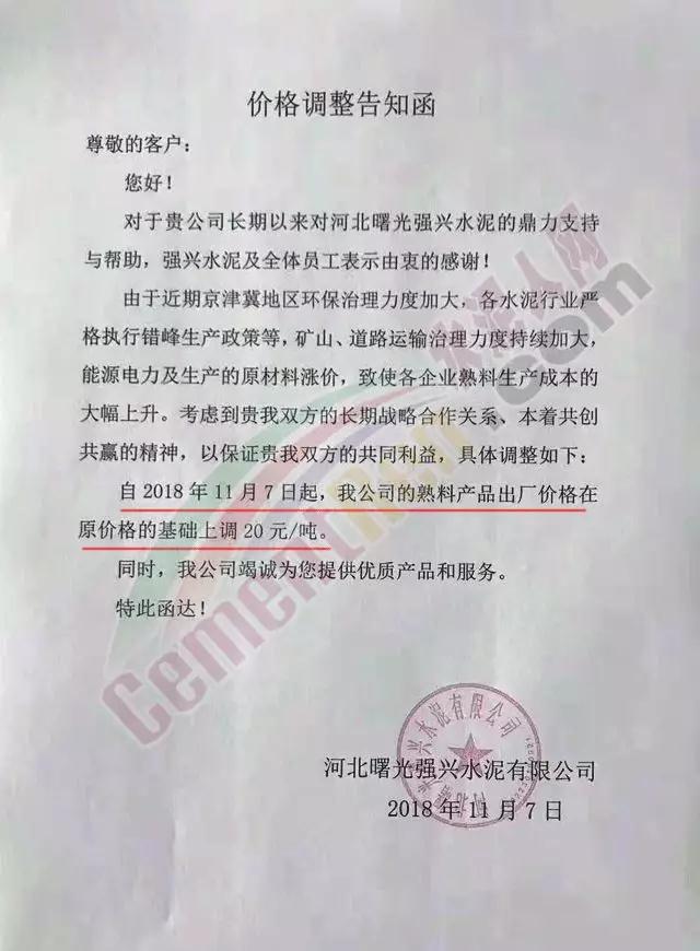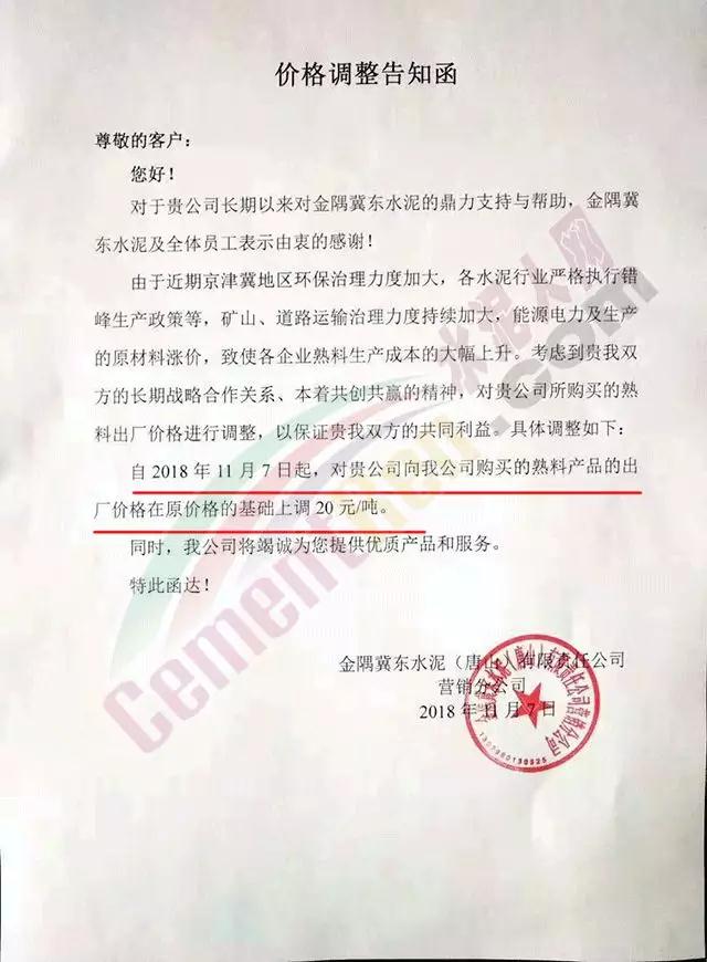 水泥人网通讯员消息:金隅冀东(唐山)有限责任公司营销分公司、河北曙光强兴水泥有限公司等企业于11月6日晚间发布《价格调整告知函》称将于今日(11月7日)起,上调熟料出厂价,调价幅度20元/吨。 《价格调整告知函》称,由于近期京津冀地区环保治理力度加大,各水泥行业严格执行错峰生产政策。矿山、道路运输治理力度持续加大,能源电力及生产的原材料涨价,致使各企业熟料生产成本大幅上升。 因此上调熟料出厂价格。价格调整告知函原文如下: