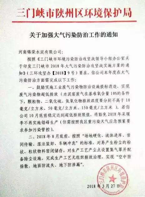 1.2018年3月,根据三门峡市物料堆场专项整治行动方案,陕州区环保局向河南锦荣水泥有限公司下达了治理通知,要求其于8月底前按照“场地硬化、流体进库、密闭传输、湿法装卸、车辆冲洗”的标准进行治理。
