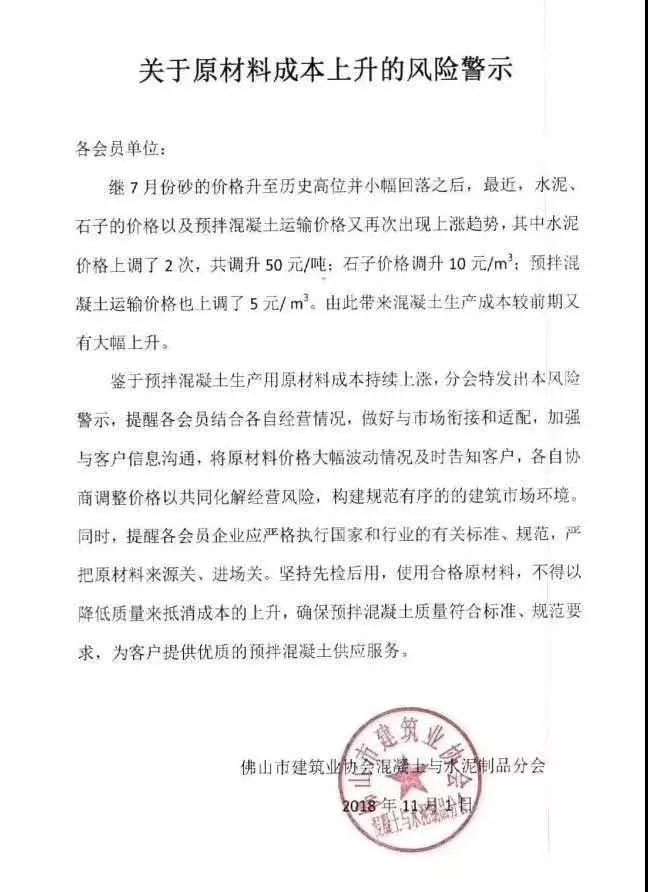 近日,佛山市建筑业协会混凝土与水泥制品分会发布关于《原材料成本上升的风险警示》,根据该警示文件称,由于受到原材料成本的上升,提醒各会员结合各自经营情况,做好与市场衔接和适配,加强与客户信息沟通,协商调整价格以共同化解经营风险,构建规范有序的建筑市场环境。