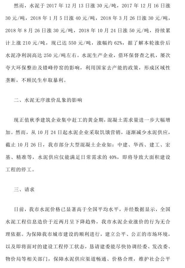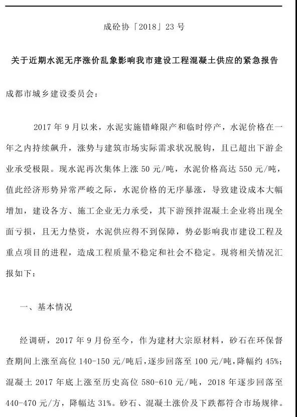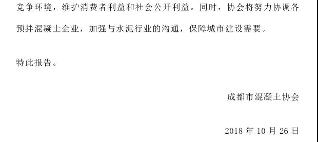 除此之外,成都市混凝土协会发布《关于近期水泥无序涨价乱象影响我市建设工程混凝土供应的紧急报告》,该文件指出成都市水泥价格持续上涨,已经严重影响到了民生,恳请建委能尽快协调经委、发改委、物价局等相关部门,保障水泥供应渠道畅通、价格合理,维护社会公平竞争环境,维护消费者利益和社会公开利益。