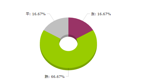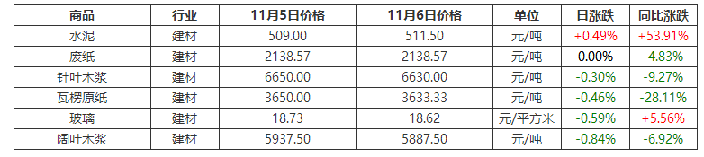 环比下降的商品共有4种,跌幅前3的产品分别为阔叶木浆(-0.84%)、玻璃(-0.59%)、瓦楞原纸(-0.46%)。