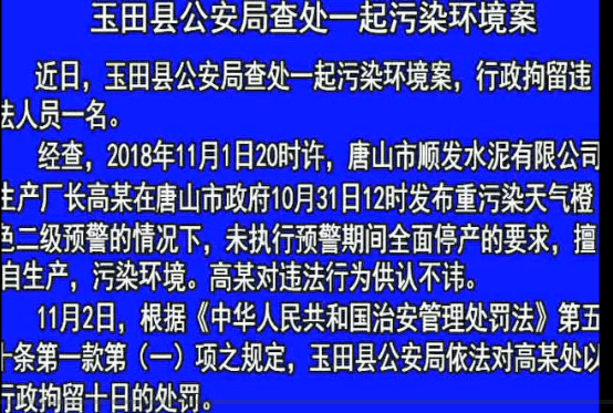 经查,2018年11月1日20时许,玉田县林西镇唐山市顺发水泥有限公司生产厂长高某在唐山市政府10月31日12时发布重污染天气橙色二级预警的情况下,未执行预警期间全面停产的要求,擅自生产,污染环境。高某对违法行为供认不讳。