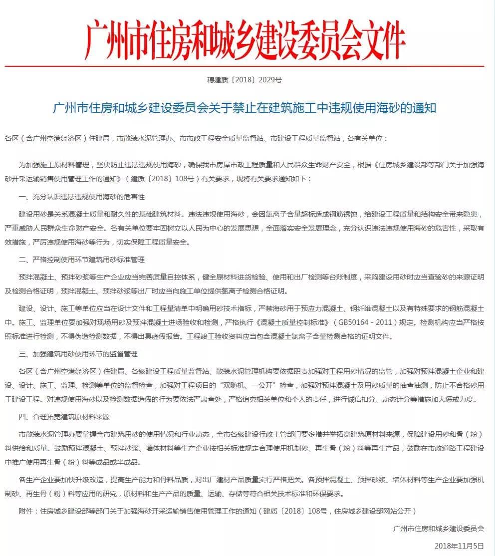 建设用砂是关系混凝土质量和耐久性的基础建筑材料。违法违规使用海砂,会给建设工程质量和结构安全带来隐患,严重威胁人民群众生命财产安全。为加强施工原材料管理,防止违法违规使用海砂,近日,广州市住房和城乡建设委员会发布《关于禁止在建筑施工中违规使用海砂的通知》,要求严禁海砂用于预应力混凝土。