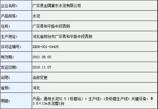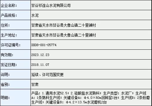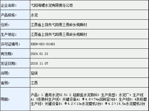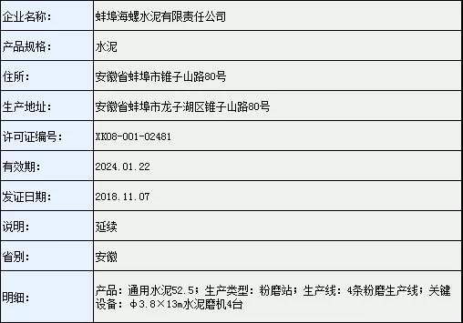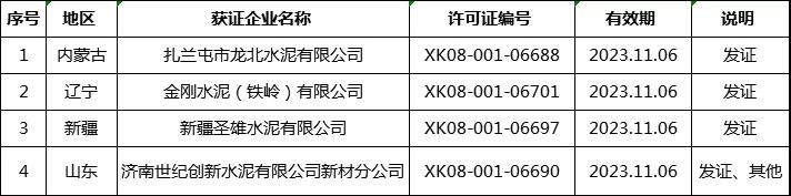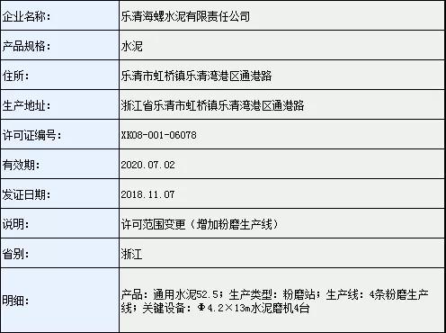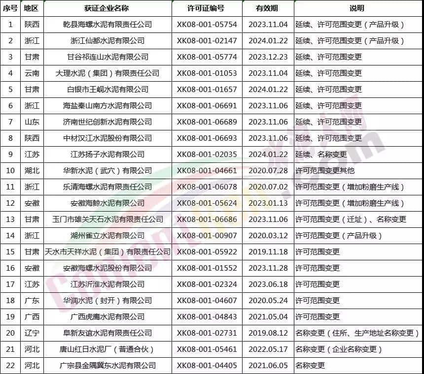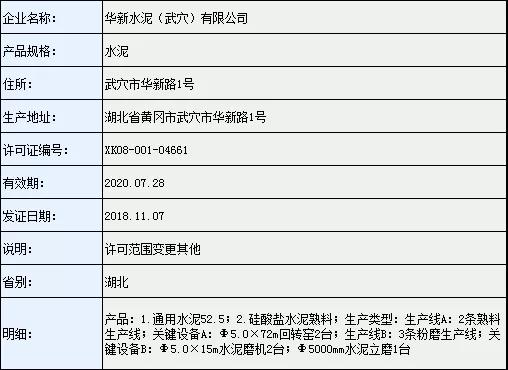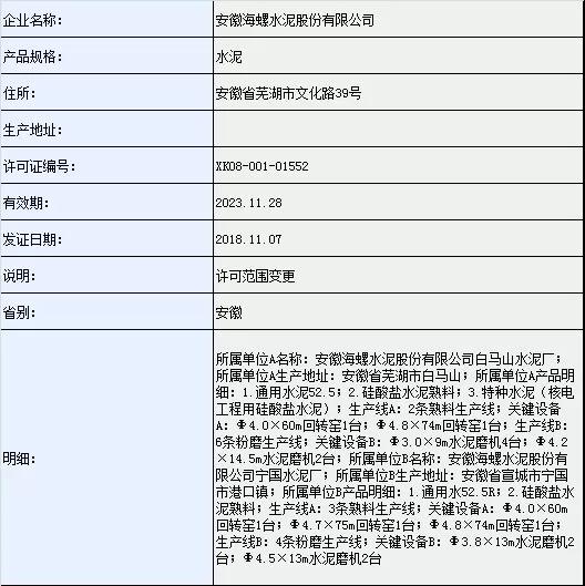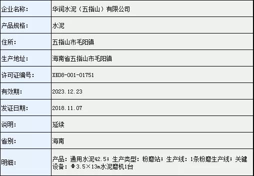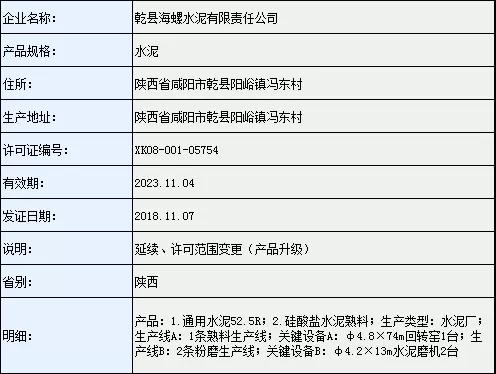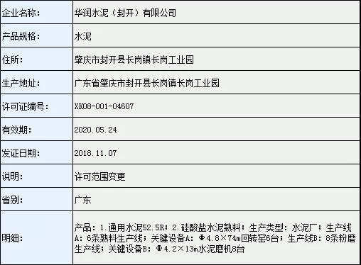生产许可证变更中涉及多家水泥集团企业子公司,五家海螺水泥公司:安徽海螺水泥股份有限公司、乐清海螺水泥有限责任公司、乾县海螺水泥有限责任公司;一家华润水泥工厂华润水泥(封开)有限公司;一家华新水泥工厂华新水泥(武穴)有限公司;一家金隅冀东工厂广宗县金隅冀东水泥有限公司;一家祁连山水泥甘谷祁连山水泥有限公司等。