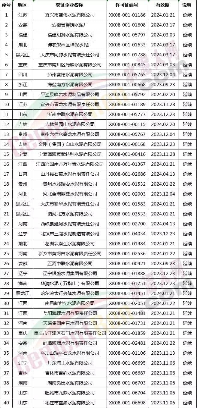 生产许可证变更中涉及多家水泥集团企业子公司,五家海螺水泥公司:安徽海螺水泥股份有限公司、乐清海螺水泥有限责任公司、乾县海螺水泥有限责任公司;一家华润水泥工厂华润水泥(封开)有限公司;一家华新水泥工厂华新水泥(武穴)有限公司;一家金隅冀东工厂广宗县金隅冀东水泥有限公司;一家祁连山水泥甘谷祁连山水泥有限公司等。海螺水泥