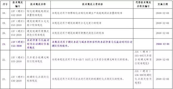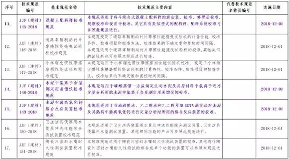 水泥行业,编号JJF(建材)145-2018的混凝土配料秤校准规范、编号JJF(建材)148-2018的水泥中氯离子含量测定用蒸馏仪校准规范、编号JJF(建材)149-2018的水泥中游离氧化钙络合反应装置校准规范、编号JJF(建材)155-2018的水泥净浆马氏流动时间自动测定仪校准规范四项校准规范被列入名单中,规范均从2018年12月1日起正式实施。