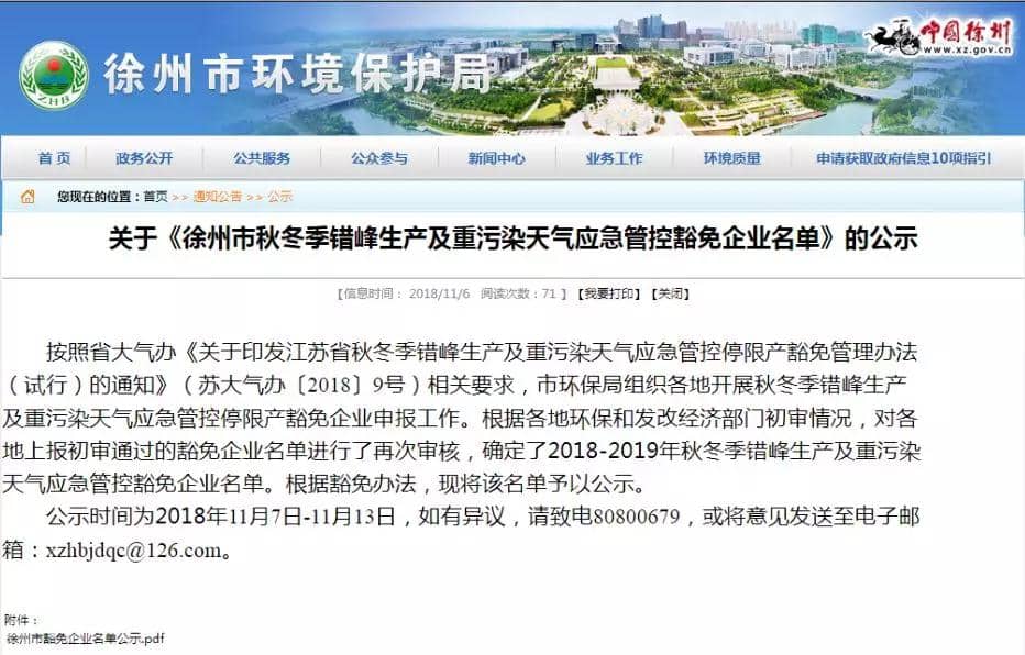 日前,徐州市环保局发布关于《徐州市秋冬季错峰生产及重污染天气应急管控豁免企业名单》的公示,按照《徐州市2018-2019年秋冬季大气污染综合治理攻坚行动方案》的要求,水泥等行业承担协同处置城市污泥、污染土壤或危险废物等保障民生任务的,根据承担任务量核定最大允许生产负荷,报当地人民政府备案。公示文件如下: