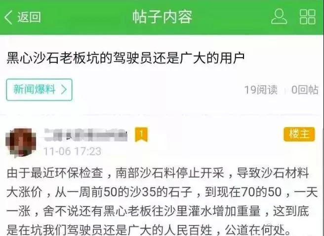 11月6日,有网友发帖称“黑心砂石老板坑的是驾驶员还是广大的用户”,帖子内容里讲到:由于最近环保检查,南部砂石料停止开采,导致砂石材料大涨价,从一周前50的砂35的石子,涨到现在70的砂和50的石子,一天一涨。还有黑心老板往砂里灌水加重量。