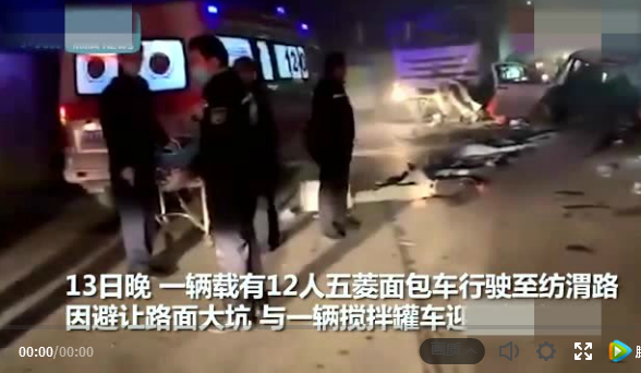 @华商报 11月13日消息,据读者刚刚反映,“今晚,一辆载有12人的陕A西安牌照五菱面包车,由南向北行驶至纺渭路窑村附近时遇路面大坑,紧急避让间与由北向南行驶的一辆搅拌罐车迎面相撞”。记者初步了解,该路段无路灯,常行渣土车。路面大坑为渣土车碾压形成。事发时间为当晚20时许,面包车超载,车上12人都是附近工地的工人。具体事故原因与伤亡情况待进一步确认。