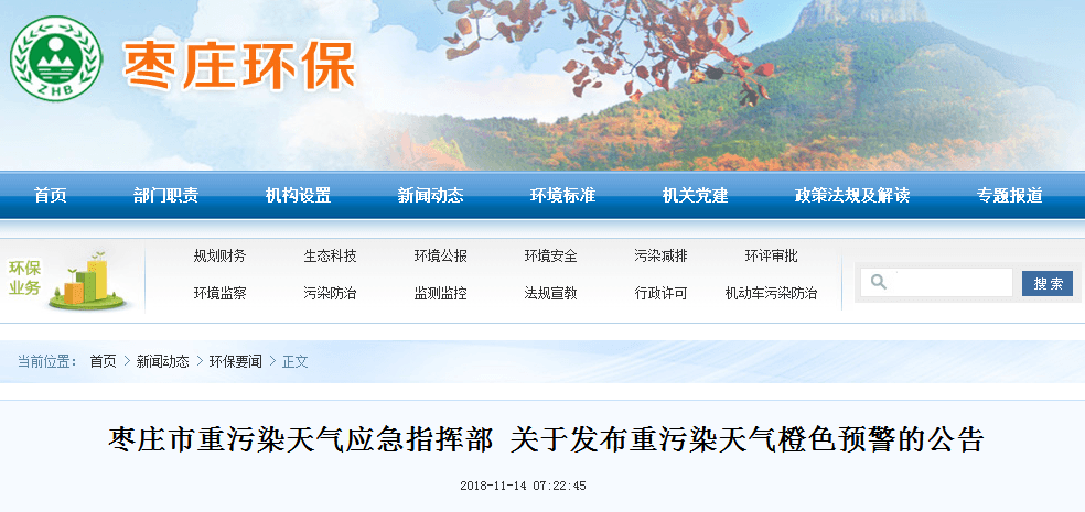 按照生态环境部统一部署,枣庄市重污染天气应急指挥部依据《枣庄市重污染天气应急预案(2018年修订)》(枣气综指〔2018〕16号),于2018年11月14日7时发布重污染天气橙色预警,定于2018年11月14日8时启动重污染天气Ⅱ级应急响应。