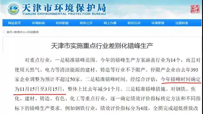根据《天津市重点行业采暖季差异化错峰生产绩效评价指导意见》要求,方案要求,在2018-2019年采暖季期间(2018年11月15日至2019年3月15日),我区对钢铁、建材、焦化、铸造、有色、化工等高排放行业,结合我市产业结构实际和企业污染排放绩效情况,实行差别化错峰生产,不搞“一刀切”。