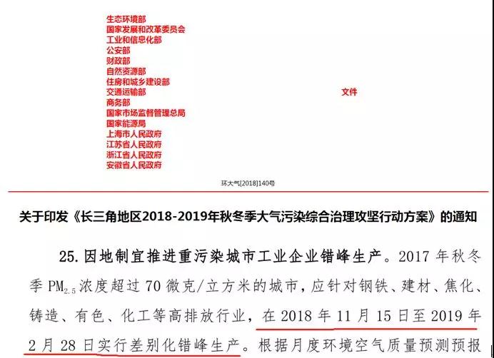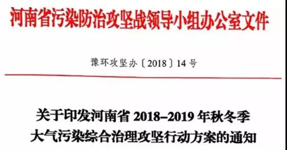河南省污染防治攻坚战领导小组办公室发布《河南省重点行业差异化错峰生产指导意见的通知(报批稿)》和《关于印发河南省2018-2019年秋冬季大气污染综合治理攻坚行动方案的通知》,其中提到,2018年11月15日至2019年3月15日,将重点对全省钢铁、焦化、铸造、建材、有色、医药(农药)等行业实施差异化错峰生产。