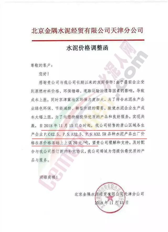 在唐山金隅冀东经贸公司发布调价通知后,北京金隅水泥经贸有限公司天津分公司也发布了调价通知,通知称因目前企业受到原燃材料价格、环保错峰、道路运输治理等因素的影响,导致成本上涨,同时京津冀地区环保力度加大,为了符合水泥生产企业绿色环保、节能减排、转型升级的需要,致使水泥企业生产成本大幅上涨。为了持续为客户提供优质产品和良好服务,实现共赢,自2018年11月15日0时起天津分公司销售的唐山区域各生产企业P.C42.5、P.S.A32.5、P.S.A32.5品种水泥产品出厂价格在原价格基础上上调20元/吨。