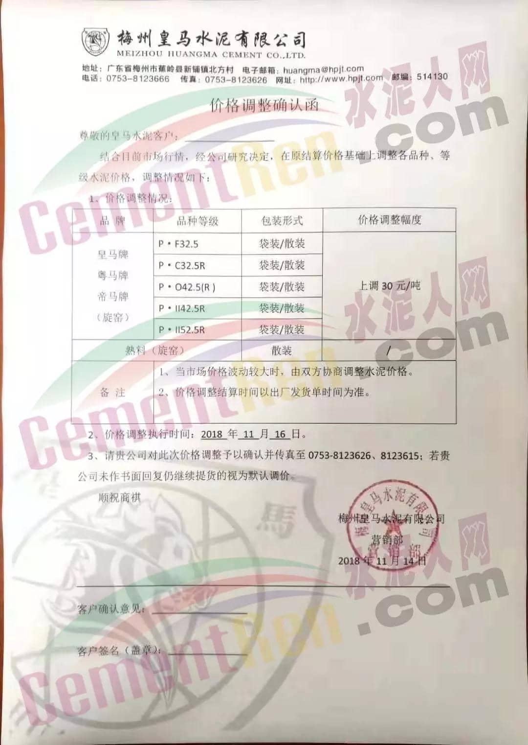 根据目前市场行情以及更加严格的环保要求,经公司研究决定,自2018年11月16日零时起,我公司所有发往广东方向的散装、袋装水泥在现有结算价基础上,上调30元/吨。不便之处,敬请见谅!