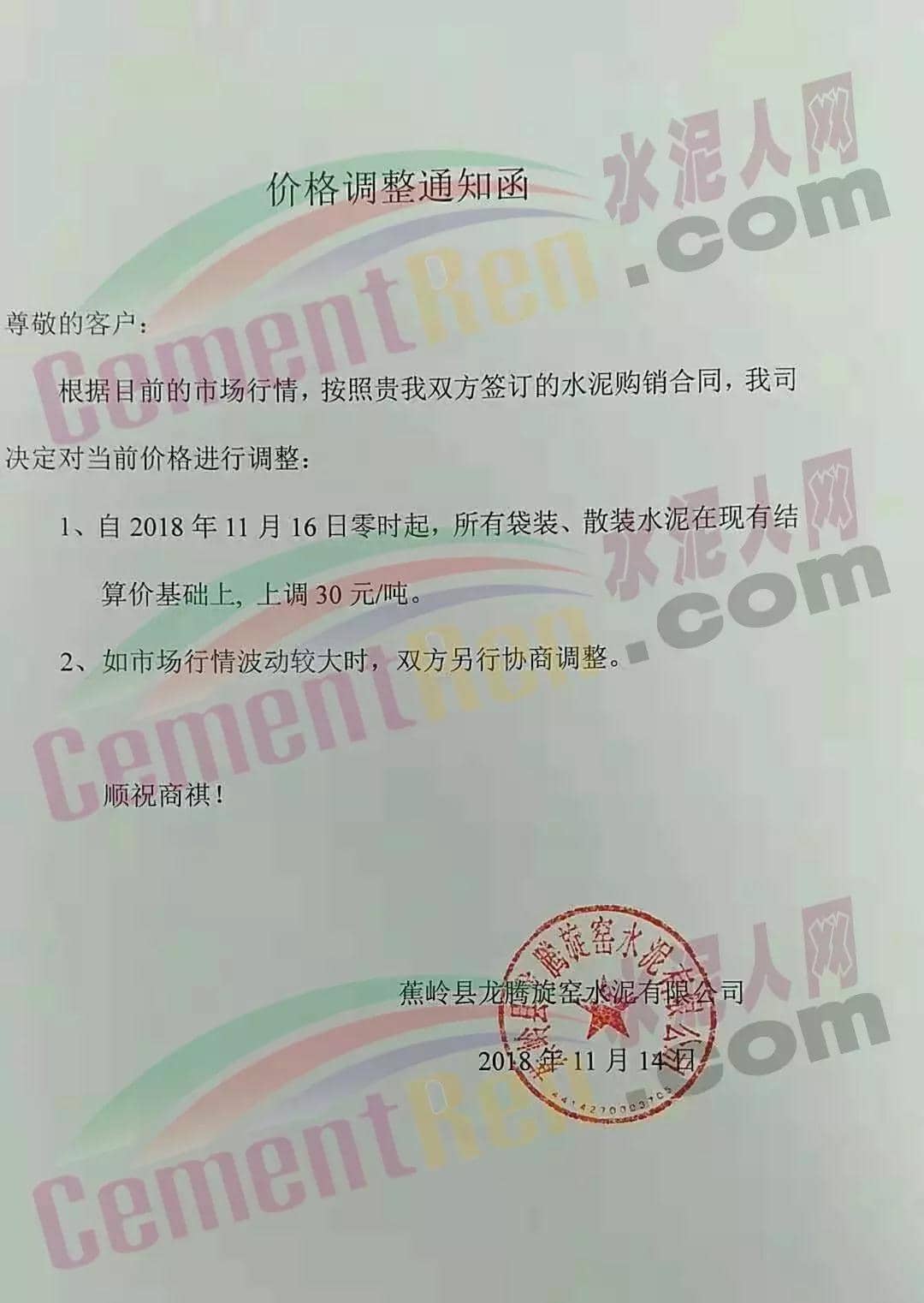 蕉岭县龙腾旋窑水泥有限公司发布价格调整通知函称,根据目前的市场行情,按照贵我双方签订的水泥购销合同,自2018年11月16日零时起,所有袋装、散装水泥价格上调30元/吨。