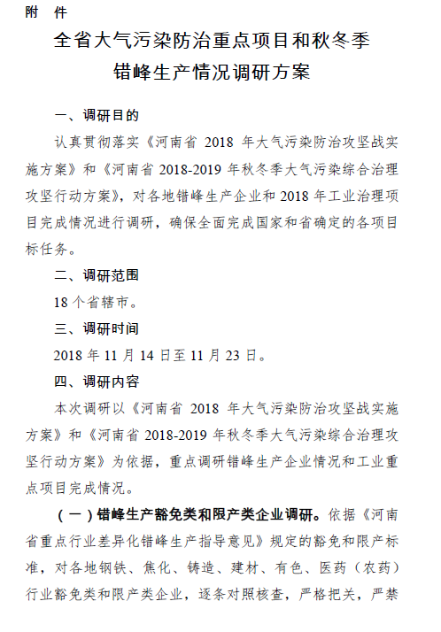 为深入贯彻党中央、国务院和省委、省政府关于打赢蓝天保卫战的决策部署,认真落实秋冬季大气污染综合治理攻坚各项措施,有效应对秋冬季重污染天气,省污染防治攻坚战领导小组办公室定于2018年11月14日至23日在全省组织开展大气污染防治重点项目和秋冬季错峰生产情况调研活动(方案见附件),请各地做好相关准备工作。